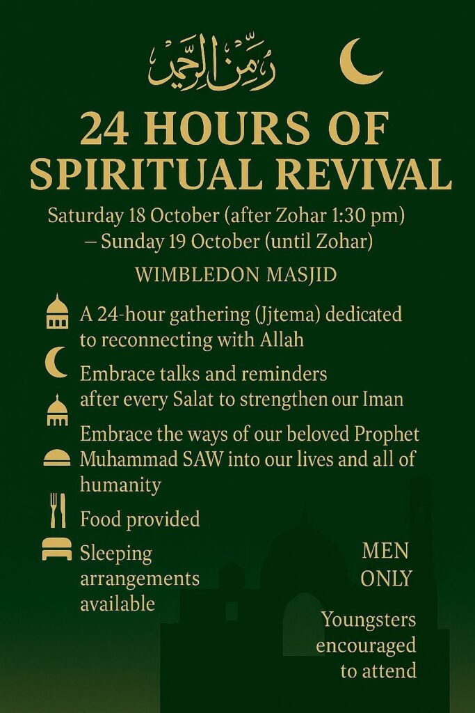- WhatsApp community – click here to join and get notifications of what takes place at Wimbledon Masjid